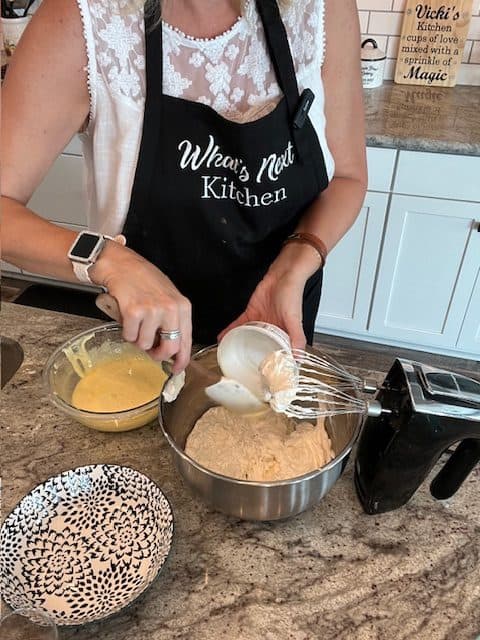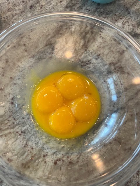 Add 1/4 Cup of sugar to egg yolks. Use a hand held mixer or KitchenAid with the whip attachment to whip the egg yolks and sugar until very light, pale yellow, almost white and double in volume. This takes about 3-4 minutes. Set aside.