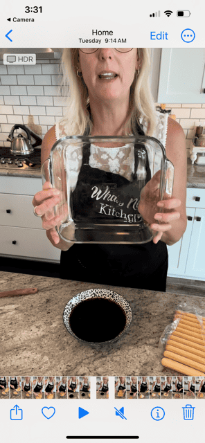 Working carefully, take the ladyfinger cookies and dunk them quickly in the coffee/kalua. Layer them in the dish. Break the cookies as needed to fit the bottom of the baking dish.