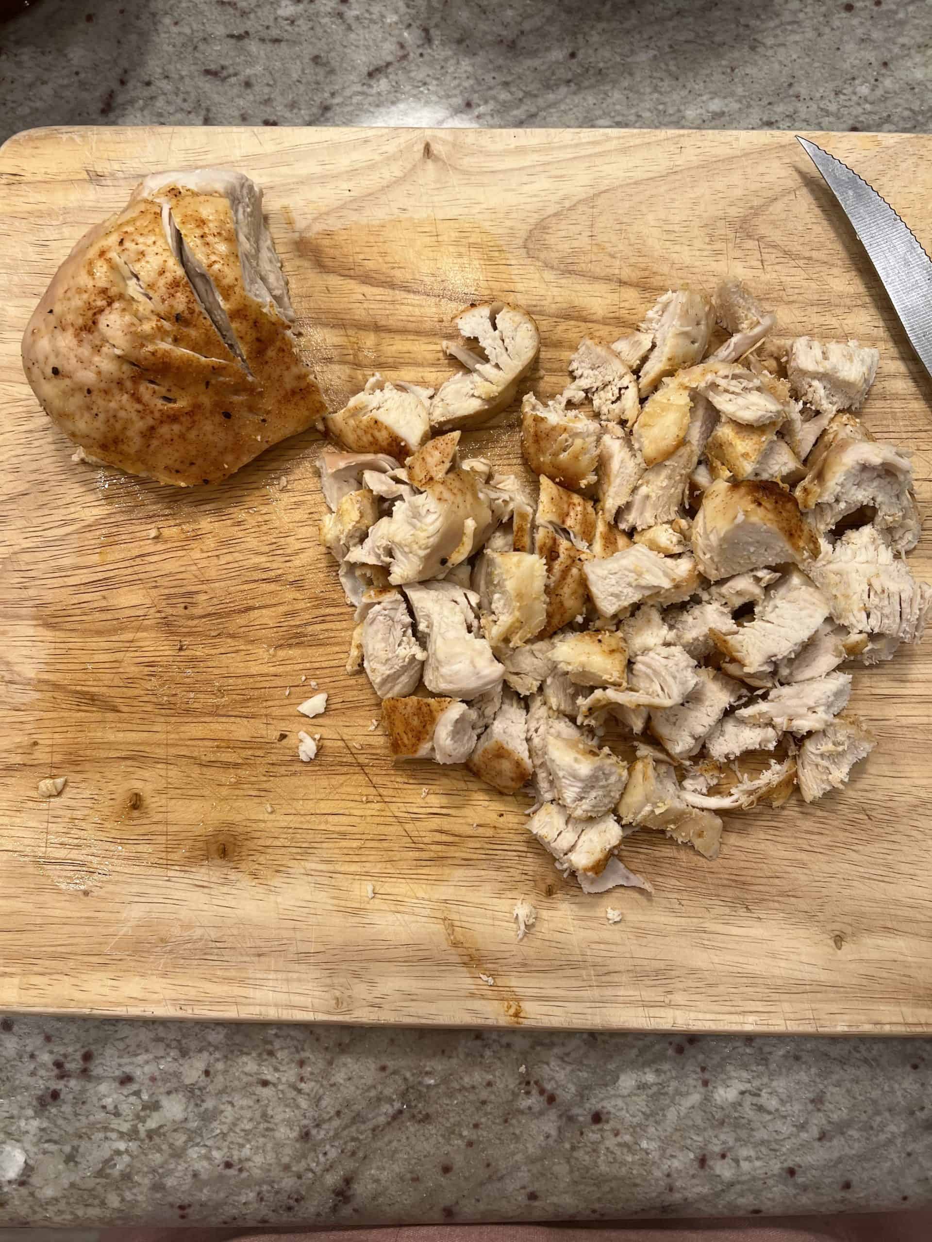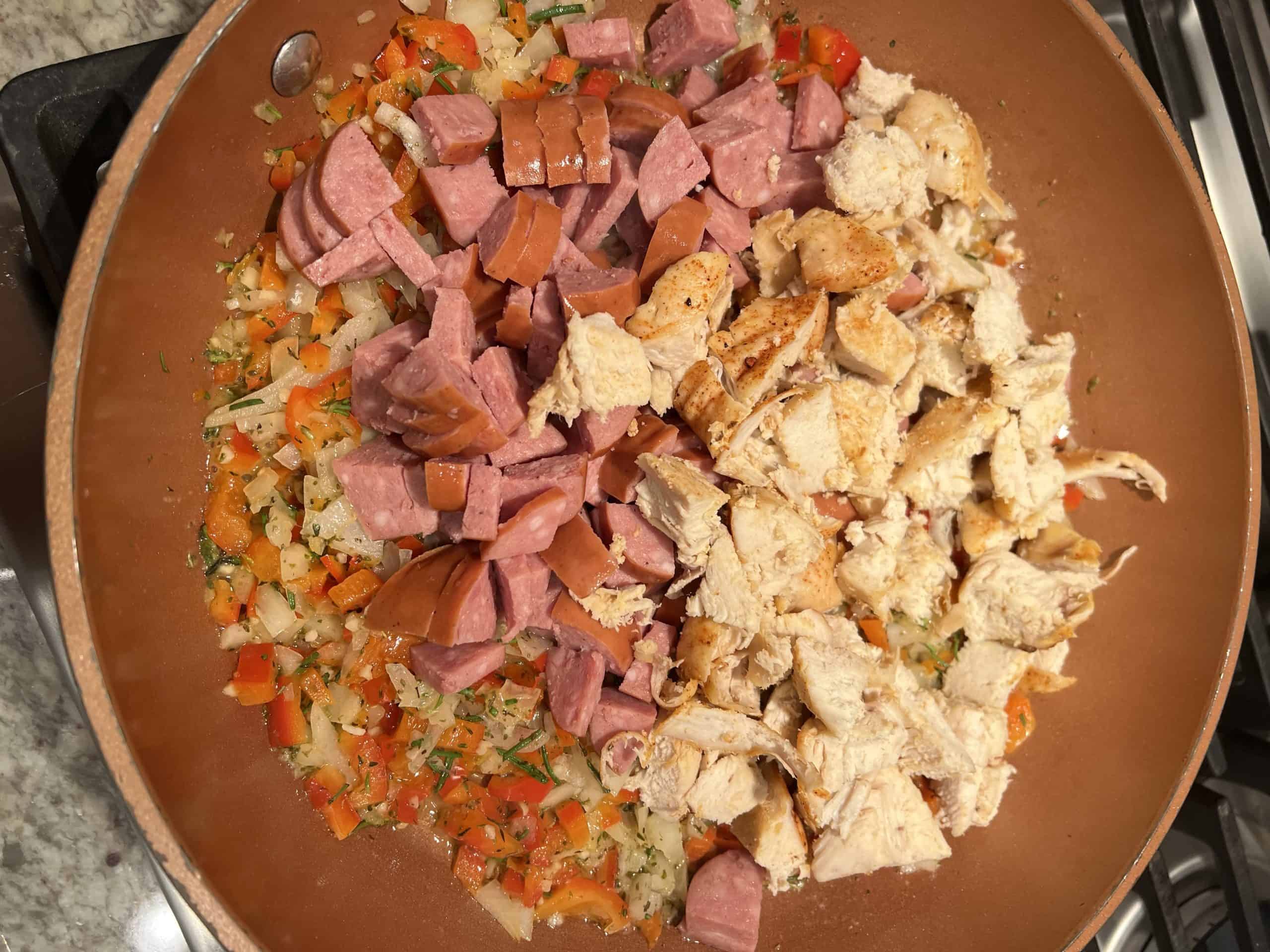 Yummy pasta dinner with veggies, loads of chicken and kielbasa sausage in a creamy white sauce