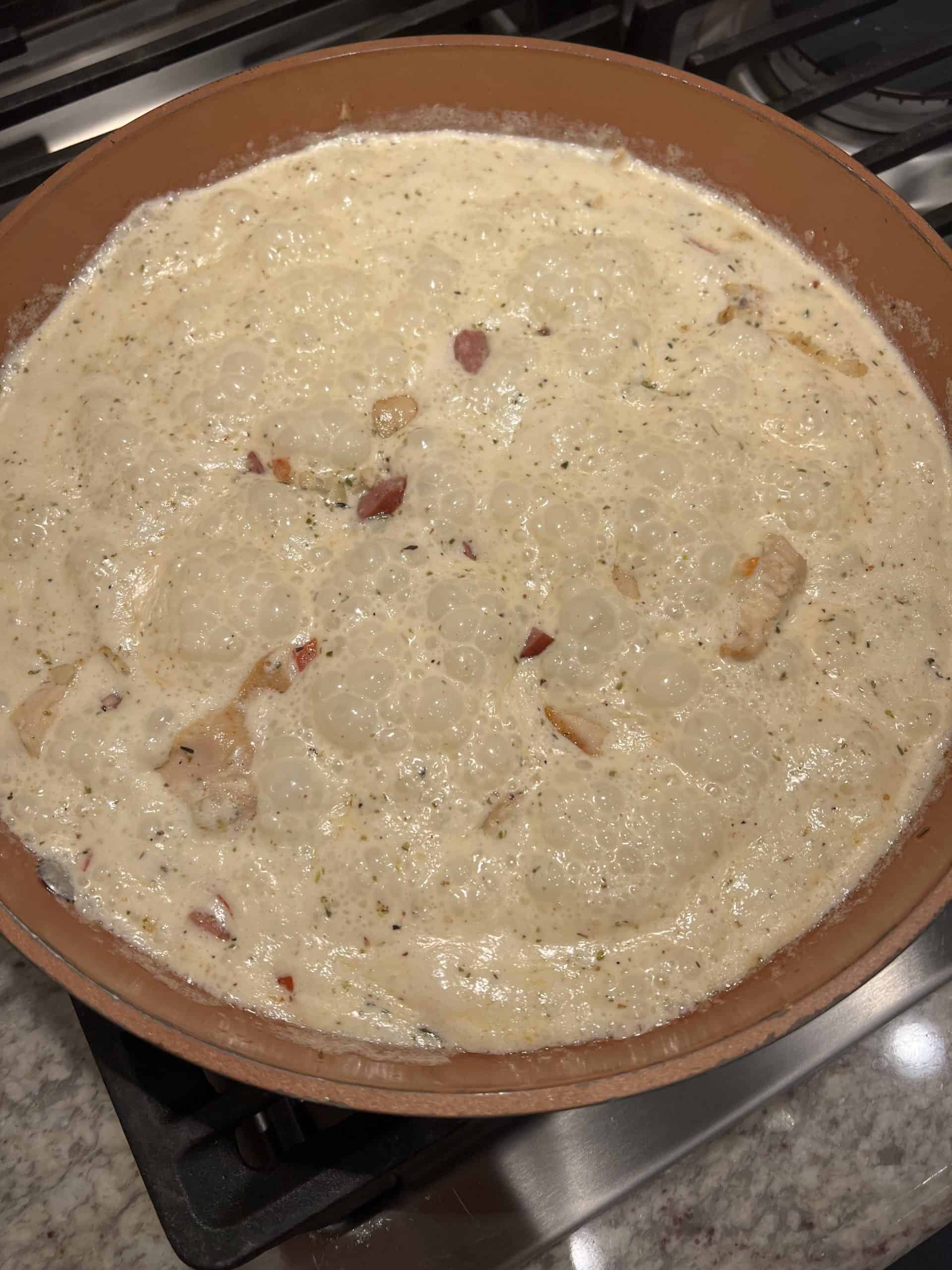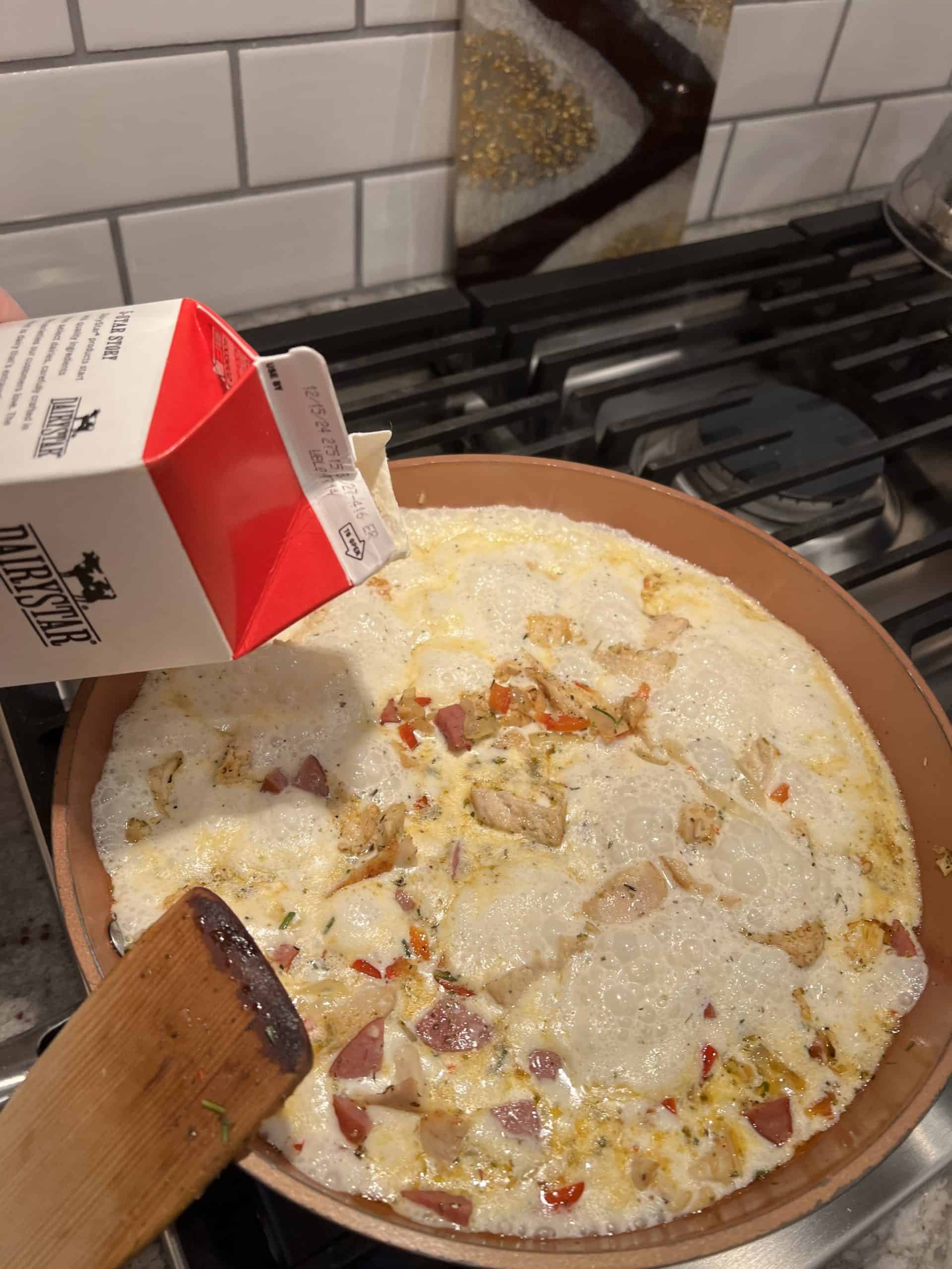 Slowly add heavy cream, until veggies and meat are covered, about 1 - 2 cups.