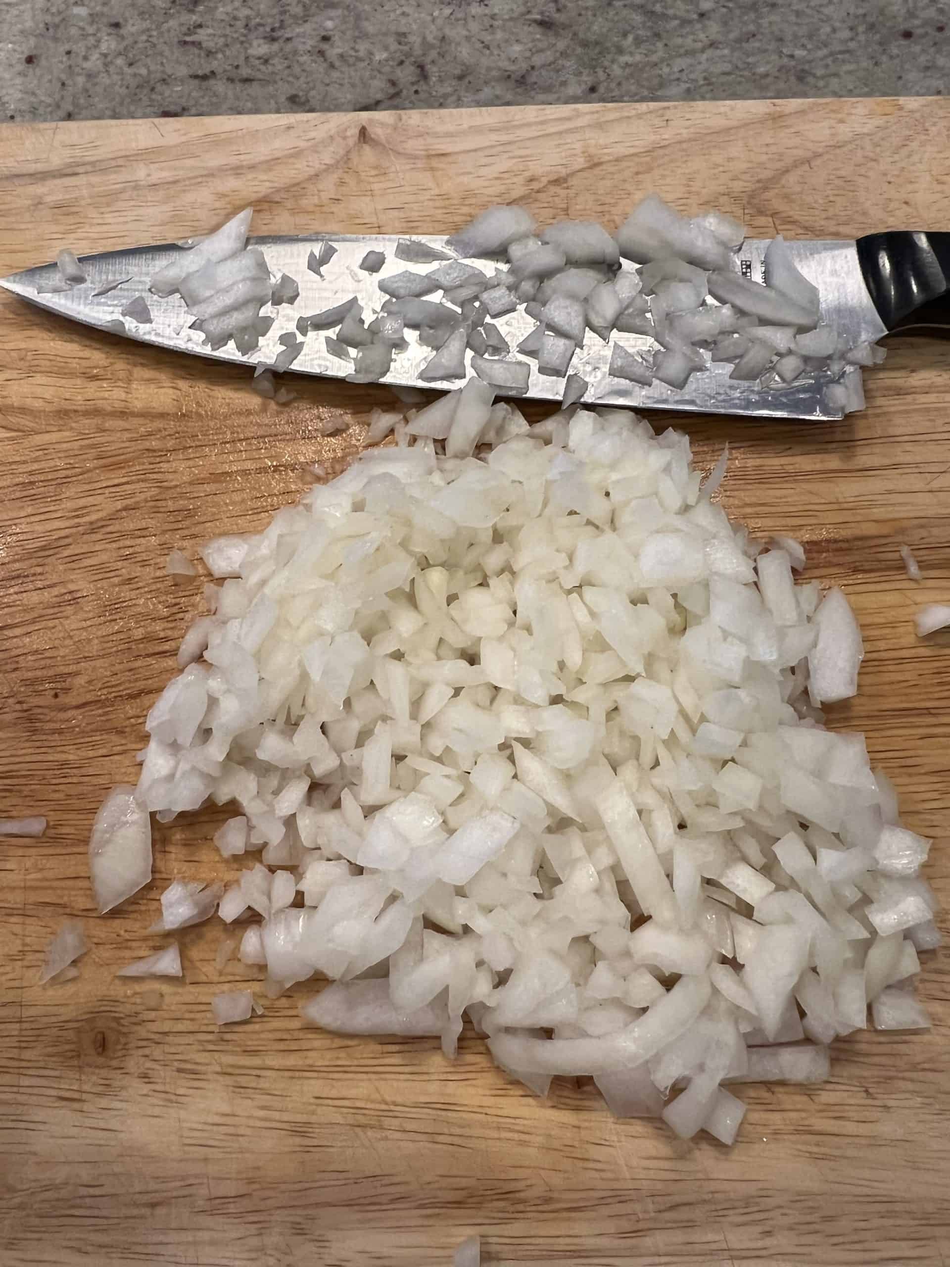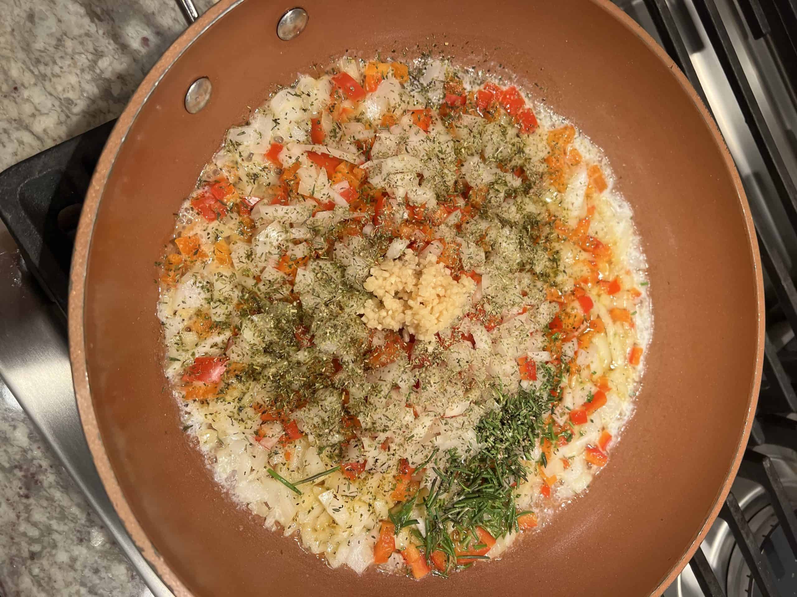 Melt butter in saucepan, add veggies, garlic and seasonings. Saute until veggies are soft, around 3-4 minutes.
