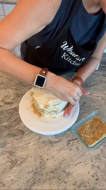 17. If adding nuts to the side of the cake, gently rotate the cake while sprinkling the finely chopped nuts until the side of the cake is coated.