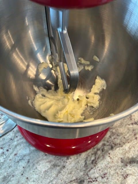 13. While the cakes are cooling, you can make the cream cheese frosting. Take a large bowl or the bowl of a KitchenAid / stand mixer and add the butter and cream cheese to it. Mix (also called "cream") the two together until well combined.