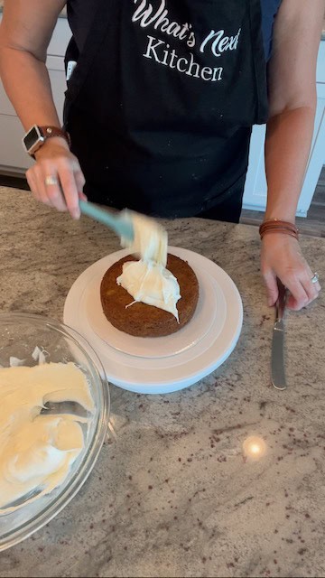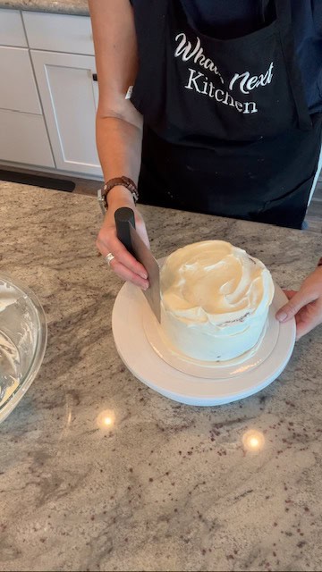 15. Gently frost the first cake layer. Add second layer and continue frosting.