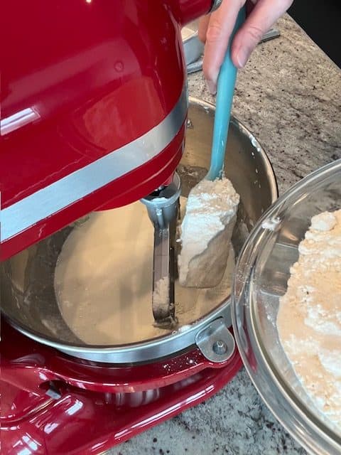 Using a rubber spatula, scrape down the sides of the butter/oil in stand mixer bowl. Turn mixer on slow speed. Starting with the dry ingredients, slowly add 1/3 of the dry ingredients to the butter mix.